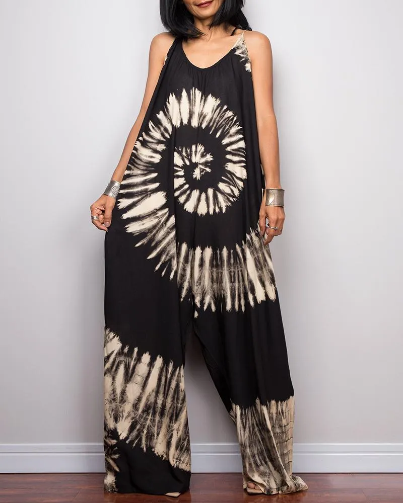 Tie-Dye Print Wide-Leg Lace-Up Loose Jumpsuit